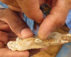 Les pierres sont concassées jusqu’à devenir un pâte grisâtre.